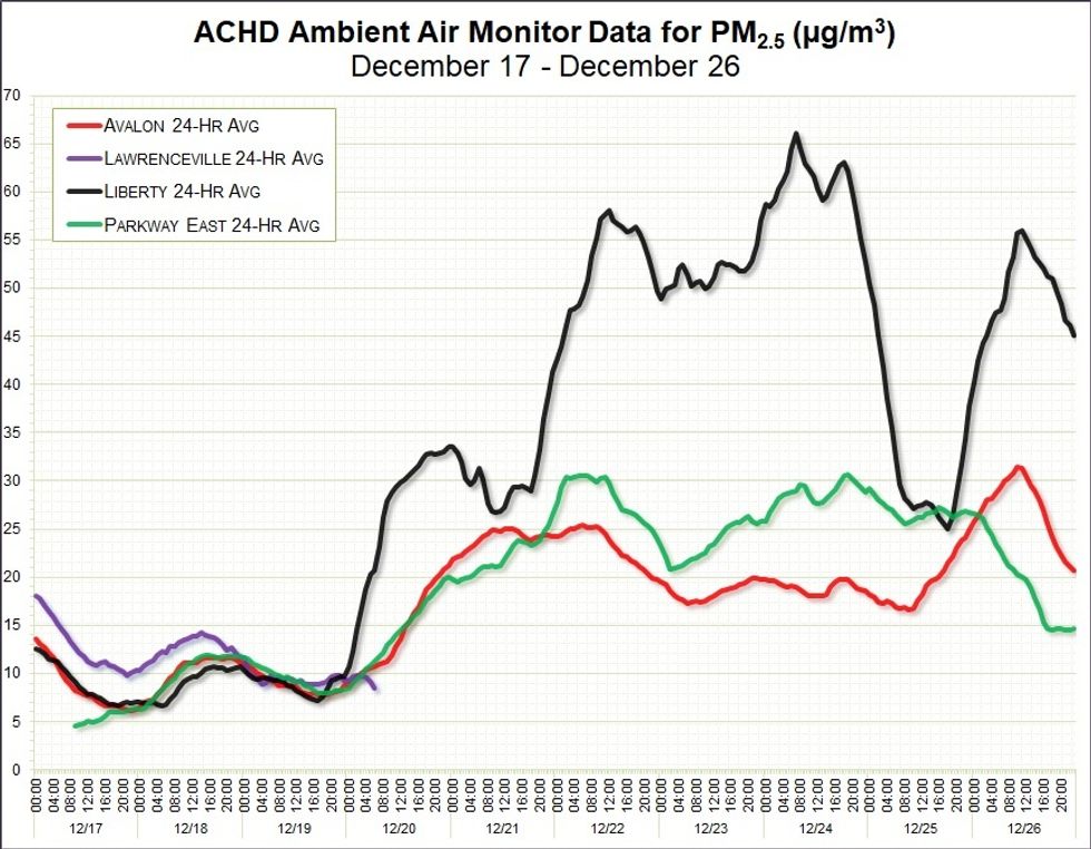 Starting on December 21, the region's air exceeded federal safety standards for daily levels of particulate matter—microscopic particles that penetrate the lungs and can trigger heart attacks and respiratory disease—for six consecutive days. One of the region's air monitors recorded the worst air quality in the entire U.S. and registered in the "Code Red" range for several hours on multiple days.