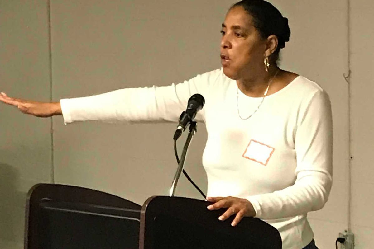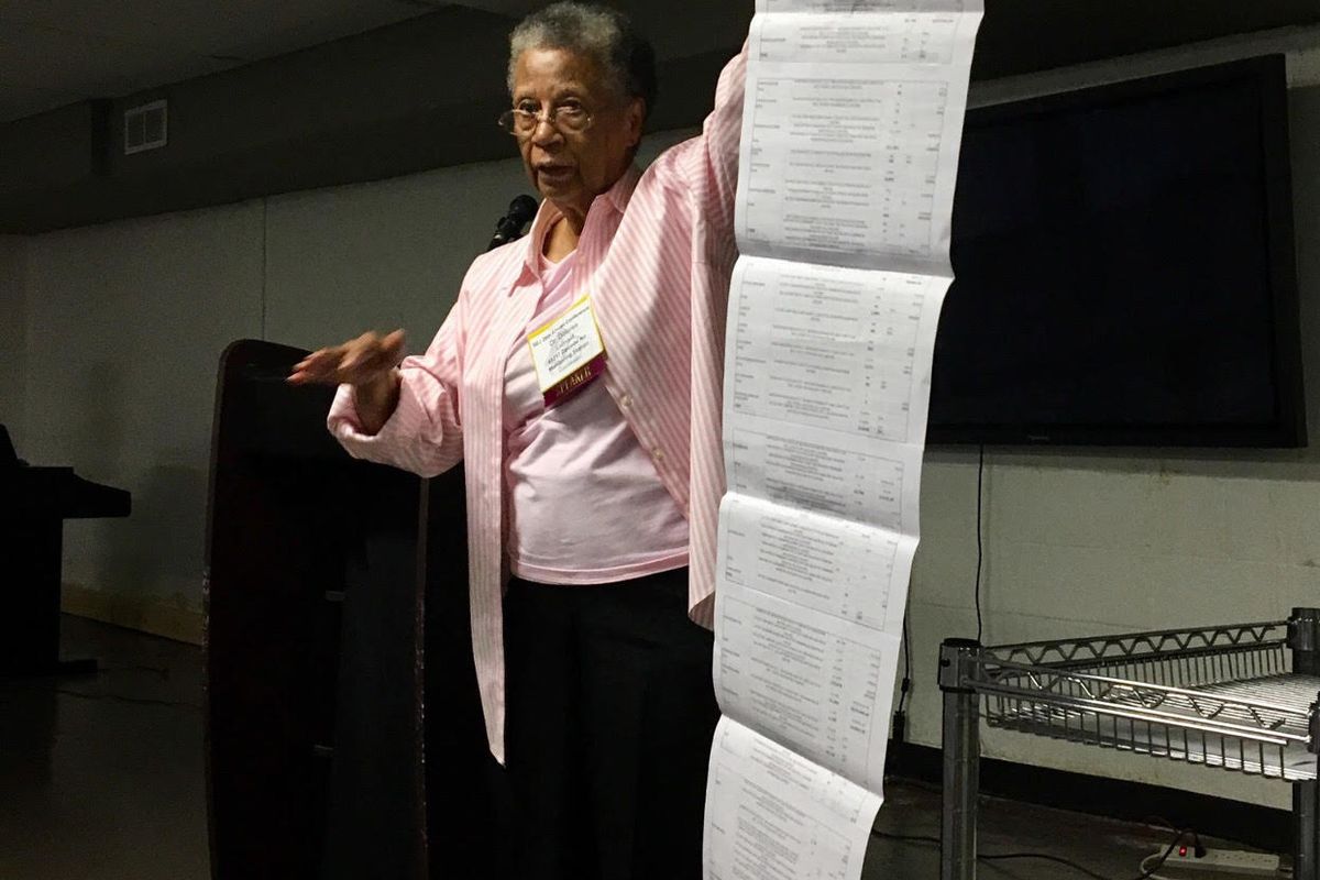 Delores Leonard holding up the analysis the community did with the TRI data and community monitoring station. (Credit: Adam Reinhardt)