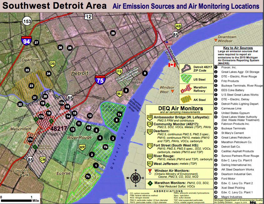 An evaluation in 2017 with a new community air monitoring station in 48217 confirmed exceedances of sulfur dioxide and also found naphthalene, arsenic and hexavalent chromium at levels of concern for cancer risk, though lower than previously measured in the 2000s.