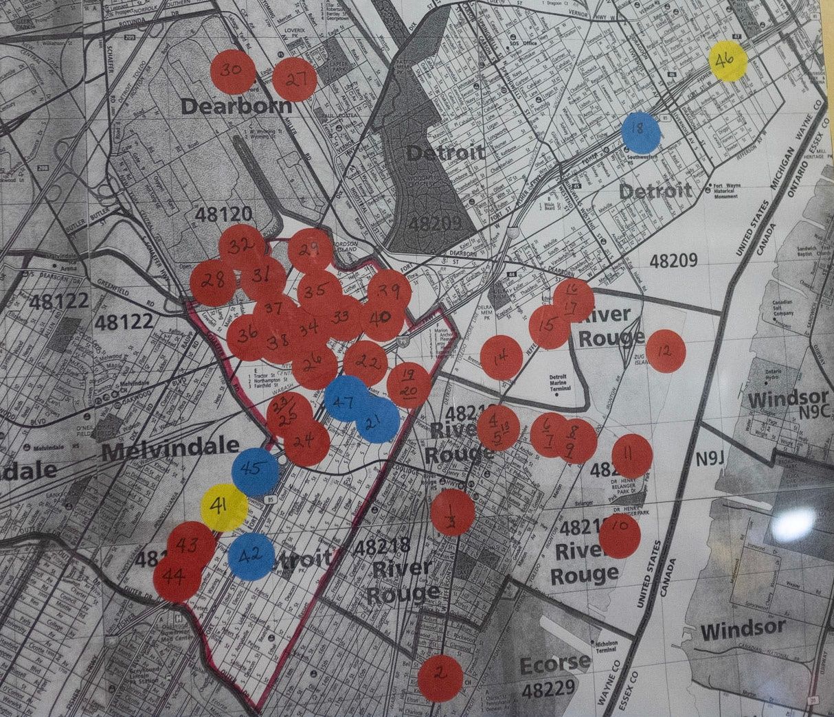 Map created by 48217 activists marking the industrial facilities surrounding their community. 48217 is outlined in red. (Credit: Meg Wilcox)