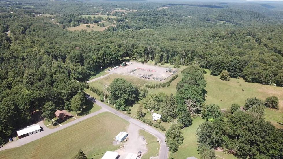 A bird's-eye view of Bryan and Ryan Latkanich's home and the fracking well pad up the hill behind it it in the summer of 2019. (Credit: Kristina Marusic for Environmental Health News)