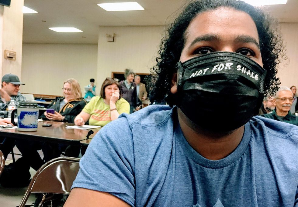 An activist wears a face mask to protest poor air quality caused by fracking, pre-COVID-19, at a 2019 community meeting in Braddock, Pennsylvania. (Credit: Kristina Marusic for Environmental Health News)