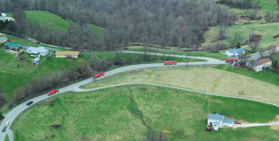 A line of fracking wastewater trucks in Moundsville, West Virginia (Credit: Ted Auch, FracTracker Alliance, 2019)