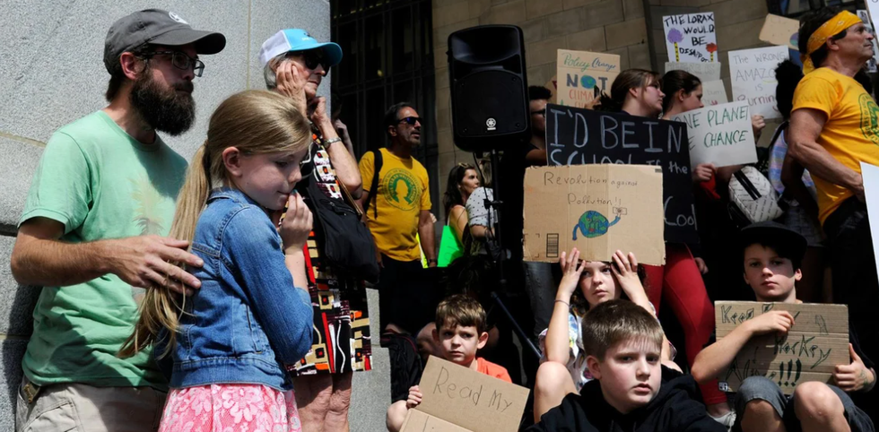 Children from two families involved in EHN's study participate in a 2019 youth climate change protest in downtown Pittsburgh. (Credit: Connor Mulvaney for Environmental Health News)