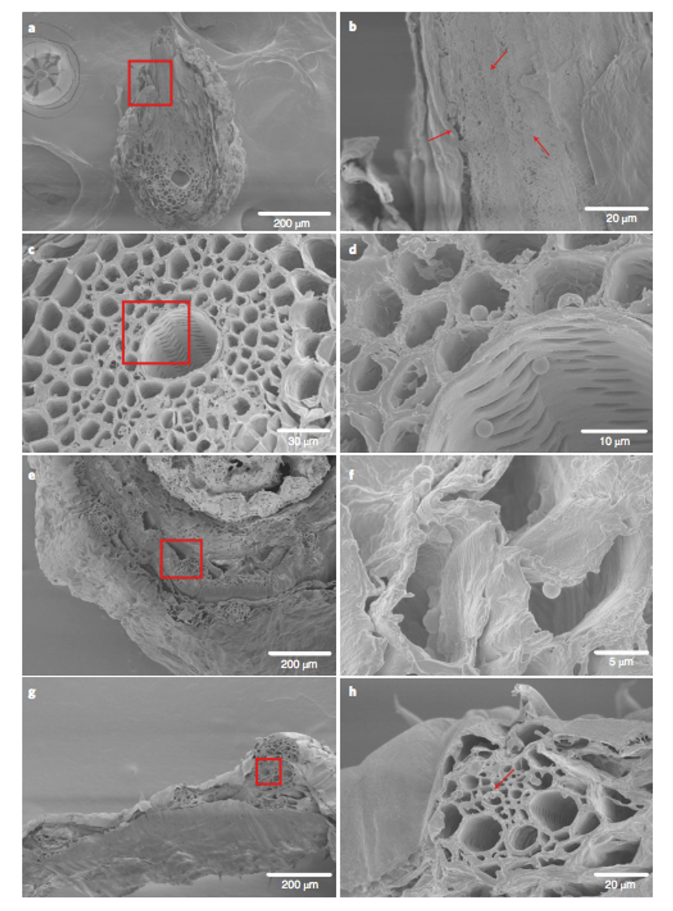 Images microbead localization in the root, stem and leaf of a wheat plant. (Credit: Effective uptake of submicrometre plastics bycrop plants via a crack-entry mode)